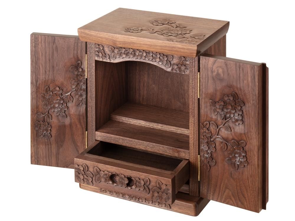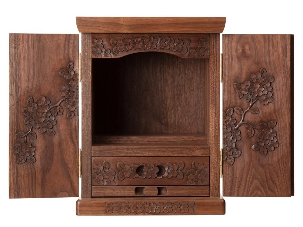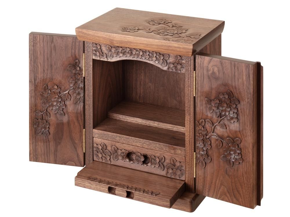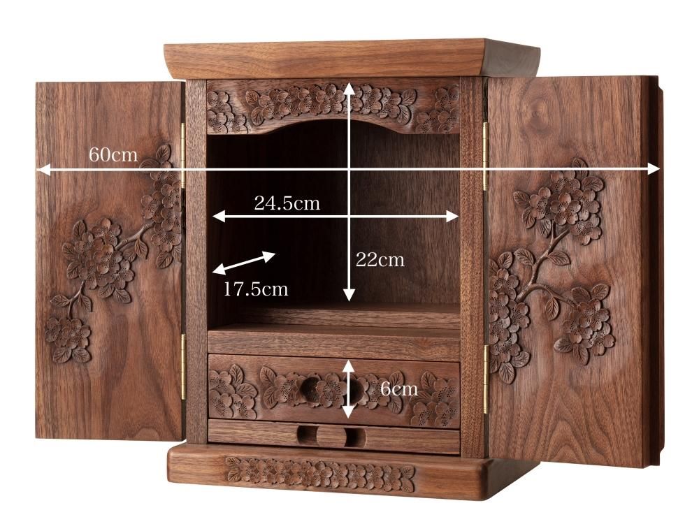※1点ずつ、職人が手作りでお仏壇を製作し、無垢の材料を使用する為、木目は写真とは異なる場合がございます。彫刻のデザインは商品写真と同じデザインですが一点一点手作業で彫刻いたしております。