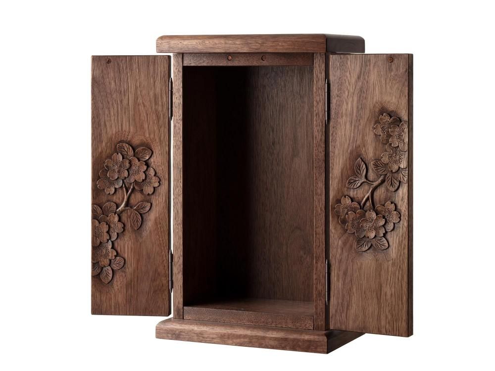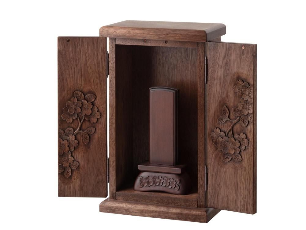 職人がこだわりを込めて作り上げた、美しいミニ仏壇。ブラックウォールナット材を使用し、オイル仕上げが施されているので、手触りも心地よく、落ち着いた雰囲気を演出します。