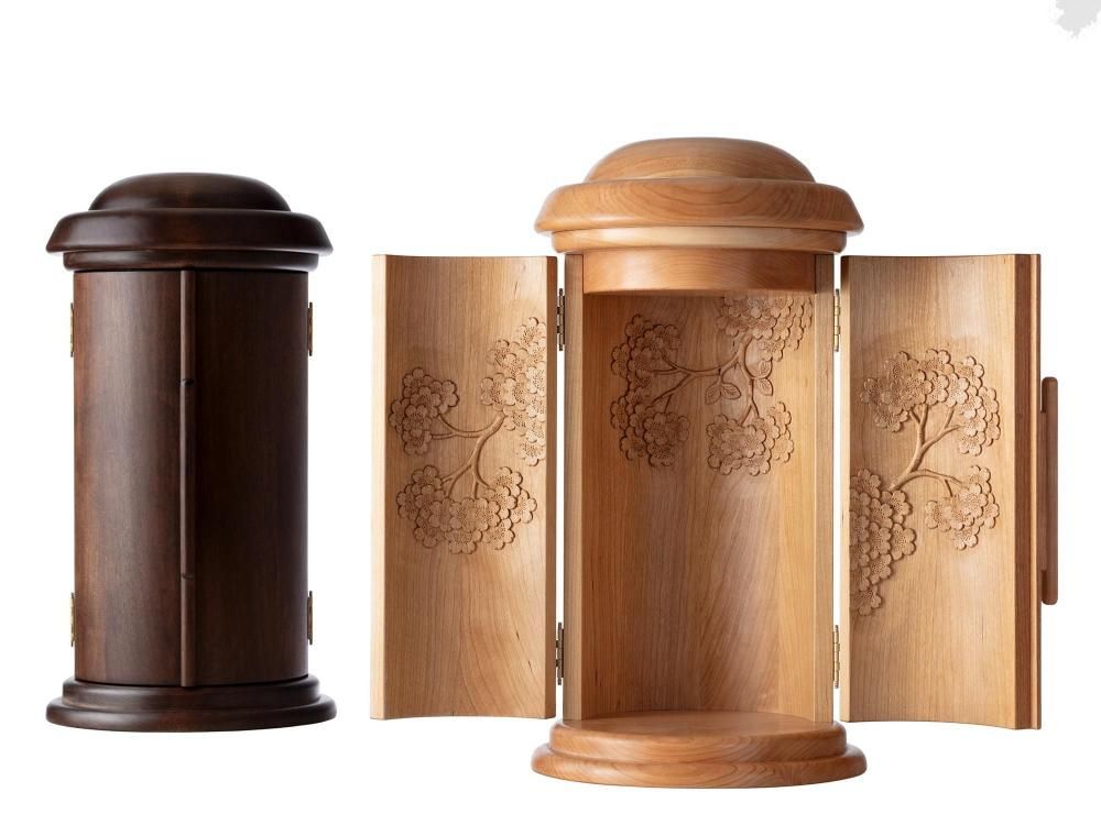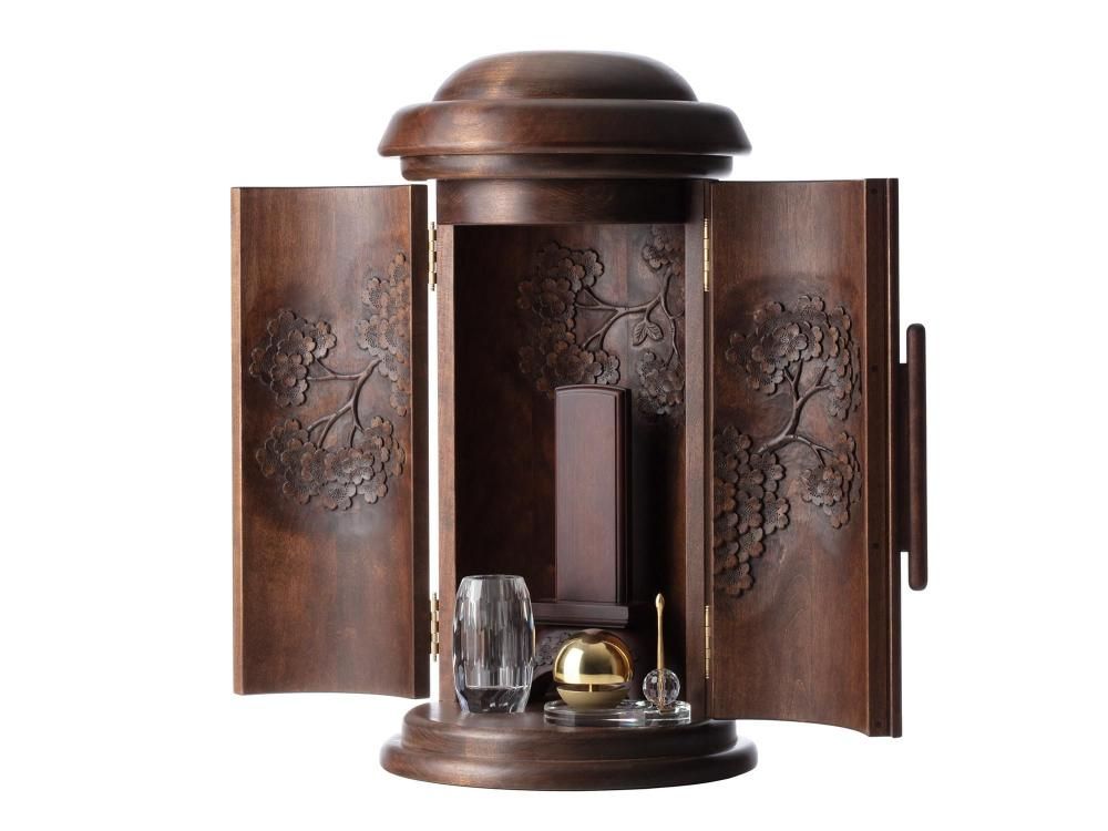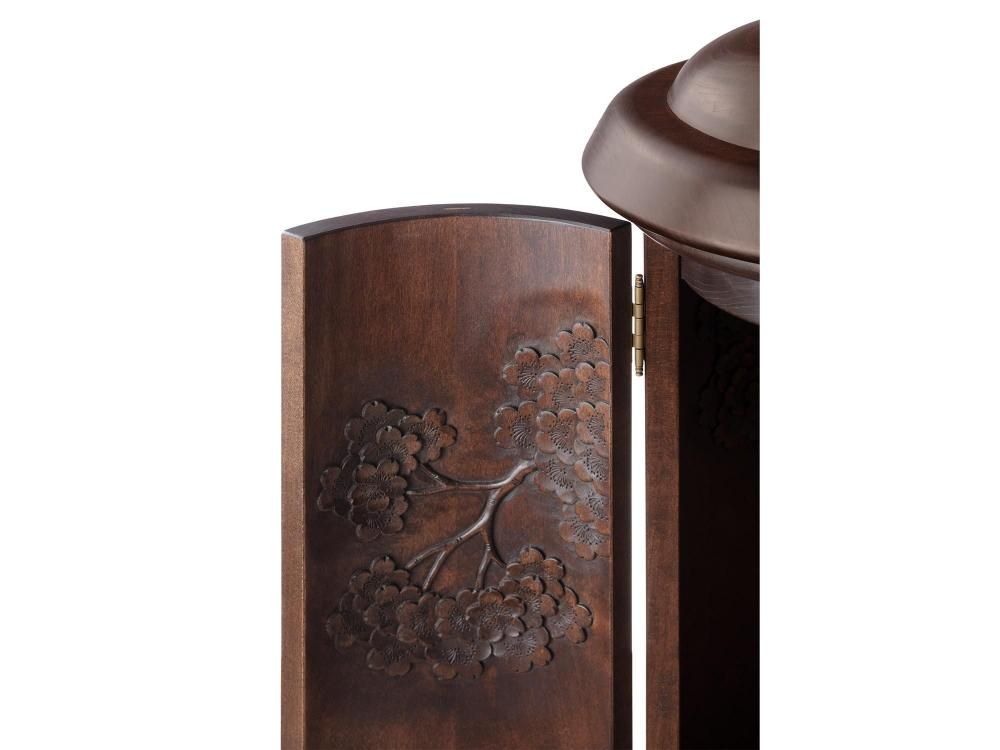 桜の繊細な彫刻は、親しみやすさと自然への感謝を象徴し、心を豊かにします。まるで生命の循環を感じさせるようなデザインは、四角い仏壇とは一線を画し、優しく包み込むような存在感を放ちます。シンプルな表面に隠された桜の模様は、開けば心を洗うほどの美しさが広がります。