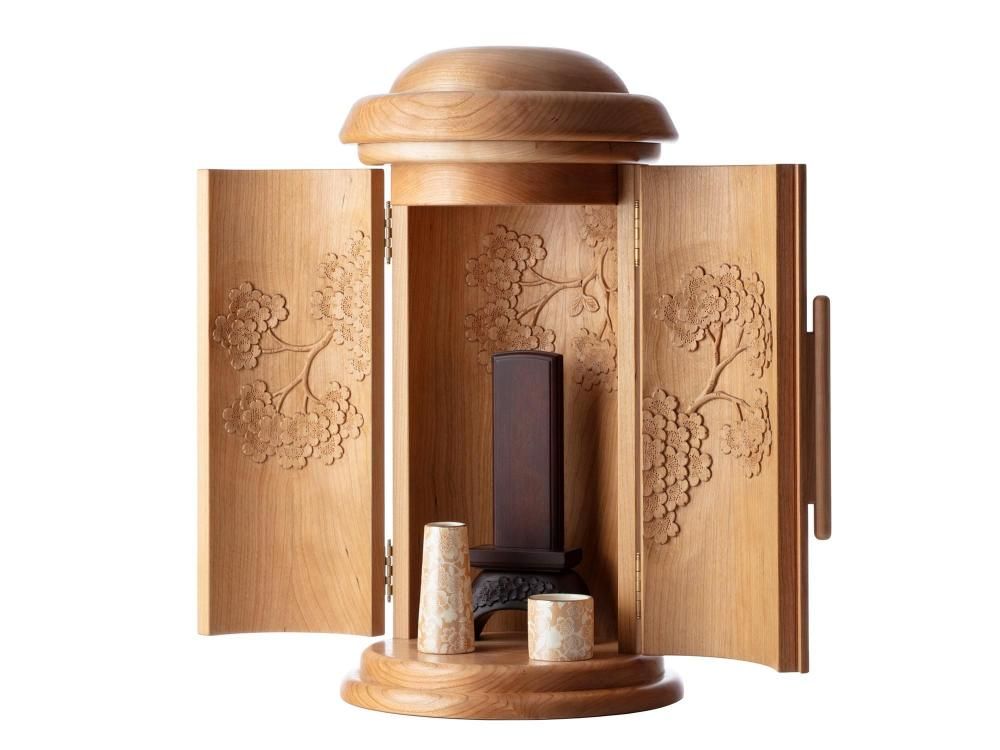 あえて表面はシンプルに彫刻せず扉を開くと桜の彫刻が見えるデザインにしました。